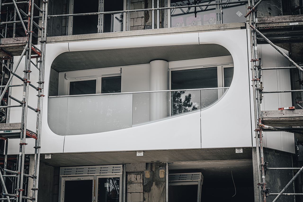Von außen präsentieren sich die Balkone als elegante, weich konturierte Elemente – eine Anspielung auf die geschwungenen Linien des automobilen Designs. Eine Lokalzeitung verglich sie kürzlich mit „halb geöffneten Autofenstern“, doch die poetischere Assoziation gilt dem geliebten VW Käfer, der in den 1950er-Jahren in Wolfsburg in Handarbeit gefertigt wurde. Diese bewusst gewählte, nostalgische Vertrautheit hat wesentlich dazu beigetragen, dass die Anwohner:innen die neue Ästhetik mit Offenheit angenommen haben.