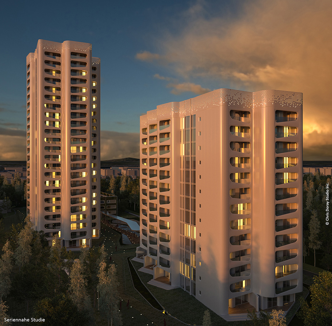 Mit Don Camillo + Peppone erhält Wolfsburg in Kürze zwei weitere markante Bauwerke, die das bestehende architektonische Profil der Stadt ergänzen. Sie fügen sich ein in die Reihe bedeutender Bauwerke wie das VW-Werk, die Autostadt, das Phaeno Wissenschaftszentrum und die identitätsstiftenden Bauten von Alvar Aalto. Die beiden Hochhäuser im Stadtteil Detmerode werden künftig durch ihre visuelle Präsenz, geprägt von einer schillernden Aluminiumfassade, als hochwertige „Lifestyle-Residenzen“ neue Maßstäbe im Wohnbau setzen.