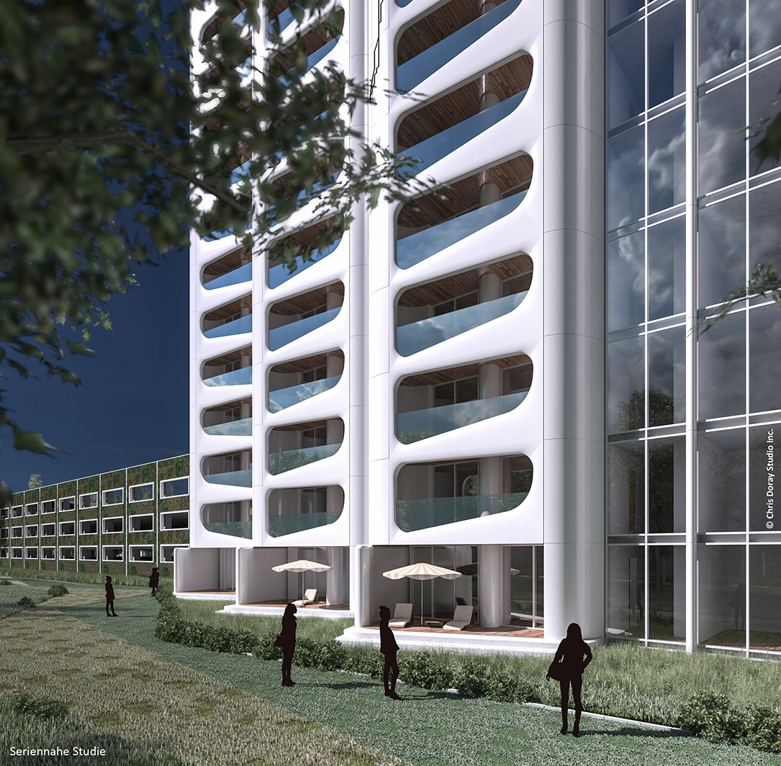 Inspired by automotive design, I envisioned balconies as sculptural extensions—like side mirrors—that frame both inward and outward views. This duality of looking in and looking out became a guiding metaphor for the dialogue between privacy and openness. These newly sculpted balconies—with their flowing, aerodynamic forms—are now the towers’ most iconic design element.