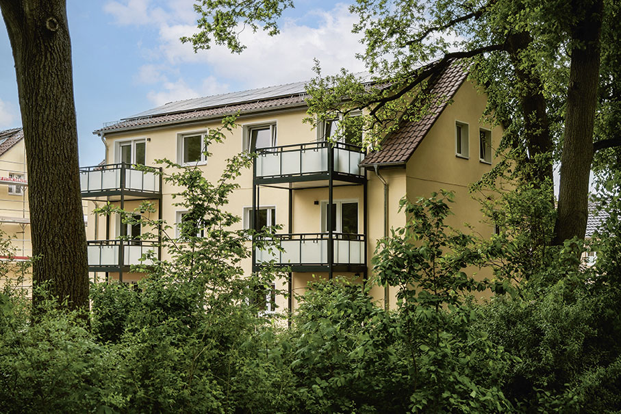 Im Fokus der Maßnahme stand die energetische Optimierung sowie die Schaffung bezahlbaren, zukunftsfähigen Wohnraums. Eine Photovoltaikanlage versorgt gemeinsam mit einer zentralen Wärmepumpe die Gebäude effizient mit Strom und Wärme – weitgehend unabhängig von fossilen Energieträgern. Ergänzt wurde das Konzept durch Dämmmaßnahmen an Dach und Fassade, moderne Fenster, neue Balkone sowie die Integration von E‑Mobilitätsinfrastruktur.